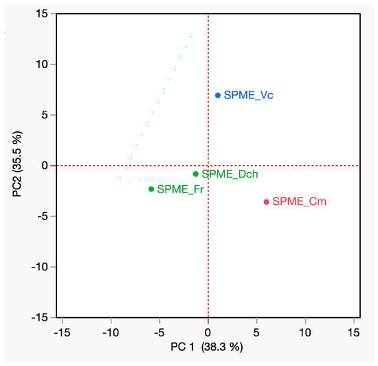 PCA score plot of the biochemical and volatile compositions of the four EFs.