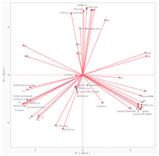 PCA biplot of the biochemical and volatile compositions of the four EFs.