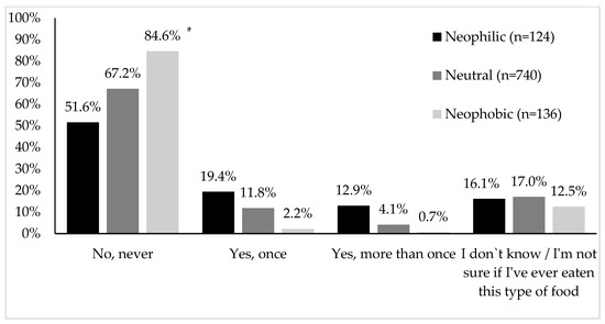 Willingness to try insects or insect-based food by food neophobia group. * Chi-square test; p < 0.0001.