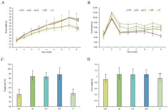 - Cai, H.; Wen, Z.; Zhao, L.; Yu, D.; Meng, K.; Yang, P. Lactobacillus plantarum FRT4 alleviated obesity by modulating gut microbiota and liver metabolome in high-fat diet-induced obese mice. Food Nutr. Res. 2022, 66, 7974. [Google Scholar] [CrossRef] [PubMed]
