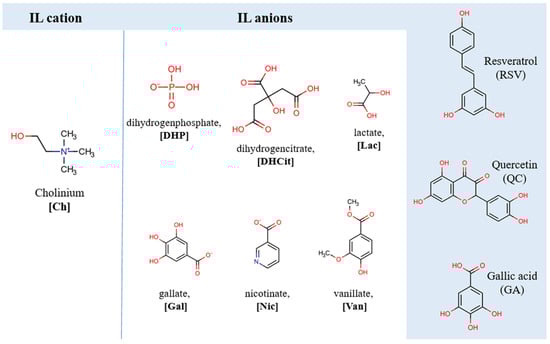 Resveratrol (purity ≥ 99 wt%), quercetin (purity ≥ 99 wt%), and gallic acid (purity ≥ 99 wt%) were acquired from ExtraSynthese (Genay, France). Propylene glycol 400 (PPG400), choline hydroxide ([Ch][OH], purity ≥ 46 wt% in H2O), cholinium dihydrogen citrate ([Ch][DHCit]), HPLC-grade acetonitrile, and HPLC-grade ethanol were purchased from Sigma-Aldrich (St. Louis, MA, USA). Nicotinic acid (purity ≥ 99%) and vanillic acid (purity ≥ 98 wt%) were procured from ThermoFisher (Dreieich, Germany), and lactic acid (purity ≥ 90%) was acquired from Fluka Chemie (Buchs, Switzerland). Cholinium chloride ([Ch]Cl, purity ≥ 98%) was obtained from Across Organic (Geel, Belgium), while cholinium dihydrogen phosphate ([Ch][DHP], purity ≥ 99%) was provided by Iolitec (Heilbronn, Germany). Cholinium vanillate ([Ch][Van]), cholinium gallate ([Ch][Gal]), cholinium lactate ([Ch][Lac]), and cholinium nicotinate ([Ch][Nic]) were synthesized in this work by following well-established protocols, via neutralization of cholinium hydroxide with the corresponding acid—vanillic, gallic, lactic, and nicotinic acid, respectively [,]. The water content was initially removed using a rotary evaporator (R-210 Rotavapor System, BÜCHI Labortechnik AG, Flawil, Switzerland) for 4 h, followed by an additional drying process at 70 °C under vacuum conditions for 36 h. ILs were subjected to Karl Fischer titration with a Metrohm 831 Karl Fischer coulometer, Herisau, Switzerland, revealing a water content of less than 400 ppm. The chemical structures of the synthesized ILs were confirmed by Fourier transform infrared spectroscopy (Nicolet iS5 spectrometer fitted with an iD7 ATR Accessory, Thermo Fisher Scientific, Waltham, MA, USA). The obtained spectra, along with peak assignments, are provided in the Supplementary Materials (Figure S1a–d). Figure 2 represents the chemical structures and abbreviations of the studied cholinium ILs/salts, as well as the structures and abbreviations of the studied polyphenolic compounds.