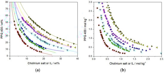 Ternary phase diagrams composed of cholinium salt or IL + PPG400 + H2O at 25 °C. The compositions are given in (a) weight percents and (b) molality units (