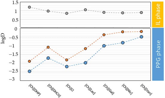In selecting appropriate ILs to evaluate the recovery performance of selected polyphenols in this work, several factors were considered. Having in mind our goal, a strong focus was placed on selecting highly biocompatible ILs that are soluble in water. This led to the choice of ILs based on the quaternary ammonium cation, specifically the cholinium cation. Additionally, the selection of anions was also crucial in tailoring the physicochemical properties and interaction capabilities of the ILs to achieve adequate solvation ability for target natural compounds. Thus, the focus was also on anions derived from natural sources, such as from plant natural acids (gallic acid, vanillic acid, lactic acid, and nicotinic acid). Moreover, ILs with anions similar to those of the target compounds, such as gallate, vanillate, or nicotinate, allow for enhanced recovery selectivity []. We also considered more common commercial cholinium salts, such as [Ch][DHP], [Ch]Cl, and [Ch][DHCit], since they all have excellent salting-out ability among cholinium ILs. Therefore, by strategically considering both cations and anions, we aimed to select highly environmentally benign and biocompatible ABS constituents that possess desirable characteristics for our intended applications. To evaluate the effects of distinct ILs on the partitions of polyphenols in the proposed IL-based ABSs, the following appropriate composition of ternary ABS mixtures was selected: 20 wt% IL + 50 wt% PPG400 + 30 wt% water. This composition of the ternary mixtures was selected based on the previously determined phase diagrams with the aim of encompassing the biphasic range of each ABS, which is defined by the system with the lowest ability to undergo liquid−liquid demixing, namely the [Ch][Van]-based ABS. Moreover, when choosing the mixture compositions of the studied extraction ABSs, we endeavored to obtain similar phase ratios (VIL_phase/Vsalt_phase~0.5) of the systems to facilitate comparison. We evaluated two key parameters, namely the logarithmic distribution coefficients (logD) and recovery efficiency (RE), both crucial for discussing the performance of each ABS in extracting specific polyphenols. LogD values serve as an effective tool to delve into the partitioning mechanisms of polyphenols, revealing the complex interplay of interactions among ABS components―PPG400, the IL, the solute, and water. Meanwhile, recovery efficiency enabled us to identify the most efficient and selective systems, guiding the design of integrated processes for recovery of polyphenols from food by-products. The data presented as logarithmic distribution coefficients (logD values) in Figure 4 clearly demonstrate the varying affinities of the selected polyphenols for different phases in ABSs. LogD values greater than 0 signify a tendency of the polyphenol to favor the PPG-rich phase, whereas values less than 0 denote a predisposition towards the hydrophilic IL-rich phase.