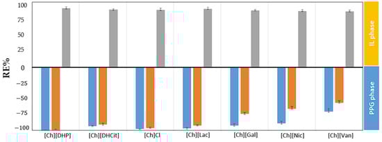 The obtained recovery efficiencies (RE%) in the IL-rich phases for gallic acid and PPG-rich phases for quercetin and resveratrol are depicted in Figure 5 (detailed results are provided in the Supplementary Materials). The RE% values align more closely with the ability to form an ABS, as opposed to the trends observed in logD values, following the following sequence: [Ch] [DHP] > [Ch][Lac] > [Ch][DHCit] > [Ch]Cl > [Ch][Gal] > [Ch] [Nic] > [Ch][Van]. The highest REs for each polyphenol were obtained for the [Ch][DHP]-based ABS, namely 99.71 ± 0.60% for RSV and 98.92 ± 1.02% for QC toward the PPG-rich phase and 92.31 ± 2.31% for GA toward the IL-rich phase. Slightly lower values (reduced by less than 5%) were obtained for [Ch][Lac], [Ch][DHCit], and [Ch]Cl. Lower recovery efficiencies for QC and RSV were found with ILs containing anions from natural polyphenol acids, namely [Ch][Gal], [Ch][Nic], and [Ch][Van], ranging from 70.29 ± 4.89% to 92.27 ± 3.07% for RSV and from 56.04 ± 3.12% to 73.65 ± 3.07% for QC. This decrease in REs is due to the less hydrophobic nature of the PPG phases in these ABSs and the capacity of the anionic ILs to engage in π–electron interactions and hydrogen bonding with RSV and QC, which could be a significant factor in their reduced recovery efficiency for hydrophobic molecules. On the other hand, RE values of GA for different ABSs are generally steadier and higher, which is in accordance with their high distribution coefficients.
