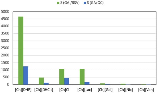 The ABS comprising [Ch][DHP]/PPG400 enables the highest partition coefficients for QC and RSV towards the PPG-rich phase and simultaneously yields the lowest coefficients for GA. This suggests that an effective separation of the examined polyphenols can be realized by selecting appropriate ABS components. Figure 6 illustrates the selectivity of the systems under study in separating resveratrol or quercetin from gallic acid. Among the evaluated ABSs, the [Ch][DHP]-based system stands out as the most selective in separating gallic acid from the other polyphenols, with a an SGA/RSV selectivity ratio exceeding 4500 and SGA/QC surpassing 1000.
