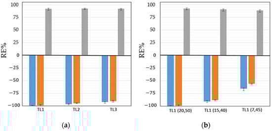 Impact of different TLLs (a) and different initial compositions along the same TL (b) on the extraction efficiencies of RSV (blue bar), QC (orange bar), and GA (gray bar) in the [Ch][DHP] + PPG400 + H2O ABS at 25 °C.