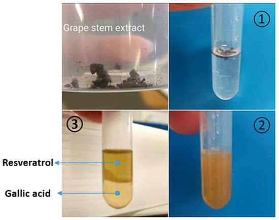 Extraction process from grape stem extract: 1—adding extract to IL + PPG400 aqueous solution; 2—mixing; 3—separation of the phases.