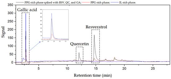 Chromatograms of IL-rich (blue line) and PPG-rich (red line) phases after solid–liquid extraction and liquid–liquid separation from grape stem using a [Ch][DHP]/PPG400 ABS. The black line represents a PPG phase spiked with a standard solution of RSV, QC, and GA.