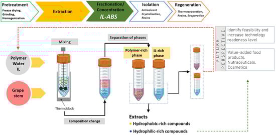 The evaluated ABS is able to remarkably recover, concentrate, and separate value-added compounds directly from grape stem samples and largely contributes to the green concept of the designed integrated separation platform. All components applied as ABS phase formers in the proposed integrated concept are benign from a toxicological point of view. PPG400 is a harmless and highly biocompatible polymer approved as a food additive by the FDA. Cholinium-based salts and ILs are safe, generally non-toxic, and biodegradable ionic compounds. A conceptual design of the developed integrated platform to extract and recover value-added compounds from food by-products is schematically shown in Figure 10.
