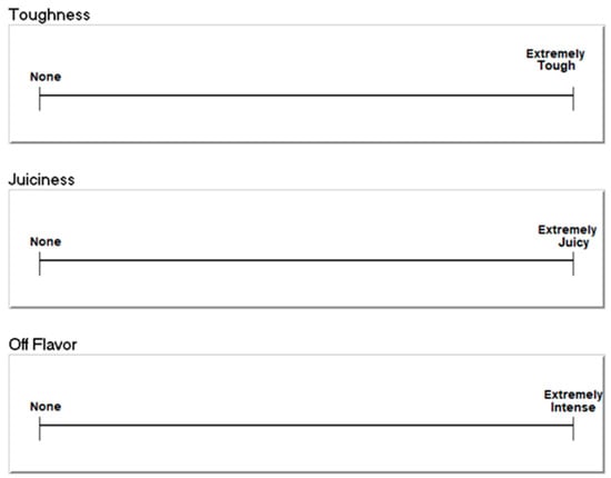Samples served to participants were balanced for order and carryover effects. Participants were asked to taste one piece of the sample and rate it for overall liking, flavor liking, and texture liking. Liking ratings were rated on a 120-point labeled affective magnitude scale with the 0 ends labeled “greatest imaginable disliking” and the 120 ends labeled “greatest imaginable liking”. Participants were then instructed to evaluate the second piece for intensity of toughness, juiciness, and off flavor. Intensity ratings were evaluated on a 20-point line scale with the 0 ends labeled “none” and the 20 ends labeled “extremely intense” for off flavor, “extremely tough” for toughness, and “extremely juicy” for juiciness (Figure 1). A score of 0 or “none” indicated that the sample was not juicy, had no off flavor, or was not tough. Sensory data were collected electronically using the SIMS 2000 software program (Sensory Computer Systems, Berkely Heights, NJ, USA).