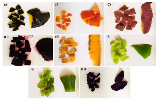 Food residues. (A) Tetsukabuto hybrid pumpkin peels; (B) moranga pumpkin peels; (C) sweet potato peels; (D) red beet peels; (E) carrot peels; (F) chayote shells; (G) cabbage stalks; (H) purple cabbage external leaves.