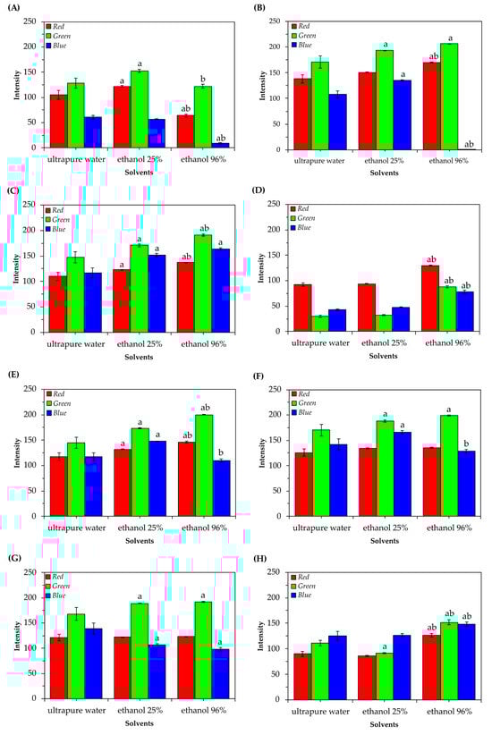 Average values (± standard deviation of the mean) of R’G’B’ of natural pigments obtained in different extractive solutions. (A) Tetsukabuto hybrid pumpkin peels; (B) moranga pumpkin peels; (C) sweet potato peels; (D) beetroot peels; (E) carrot peels; (F) chayote shells; (G) cabbage stalks; (H) purple cabbage external leaves. In each figure, columns with different letters indicate statistically significant differences at the 5% level by the Tukey Test, with “a” to water and “b” to ethanol 25% of the corresponding color.
