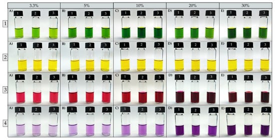 Natural pigments extracted from different concentrations of food residues (3.3%; 5%; 10%; 20; and 30%). (1 A–E) Pigments from tetsukabuto hybrid pumpkin peels; (2 A–E) pigments from moranga pumpkin peels; (3 A–E) pigments from beetroot peels; (4 A–E) pigments from purple cabbage external leaves.