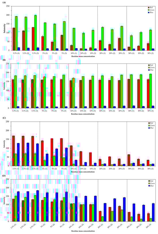 RGB average values (±standard deviation of the mean) of natural pigments triplicates extracted from different concentrations of waste (3.3%; 5%; 10%; 20%; and 30%). (A) Pigments obtained from tetsukabuto hybrid pumpkin peels; (B) pigments obtained from moranga pumpkin peels; (C) pigments obtained from beetroot peels; (D) pigments obtained from purple cabbage external leaves.