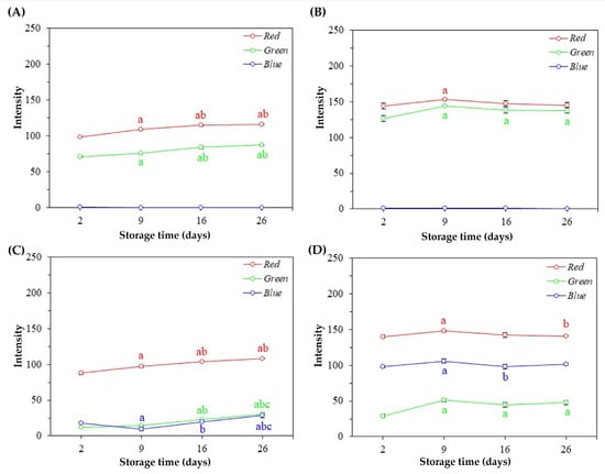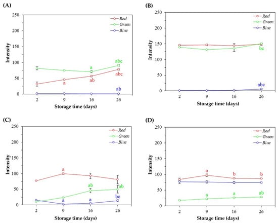 RGB average values (±standard deviation of the mean) of natural pigments during the storage time. (A) Pigments obtained from tetsukabuto hybrid pumpkin peels; (B) pigments obtained from moranga pumpkin peels; (C) pigments obtained from beetroot peels; (D) pigments obtained from purple cabbage external leaves. In each figure, different letters indicate statistically significant differences at the 5% level using the Tukey Test, with “a” in relation to 2 days, “b” in relation to 9 days, and “c” in relation to 16 days.