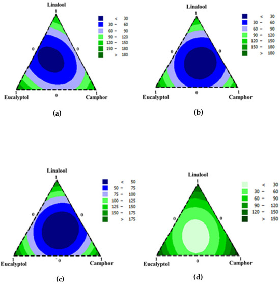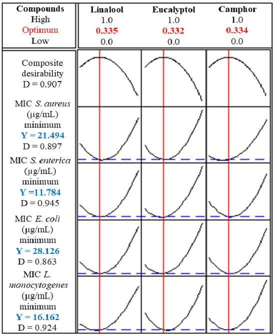In this study, the main reason justifying the selection of linalool, eucalyptol, and camphor was the fact that the combination of oxygenated monoterpenes could increase their ratio and, accordingly, their effectiveness in producing a synergistic effect against pathogenic and foodborne bacteria [47]. Therefore, the SCMD model was designed to find a powerful formulation that could inhibit bacterial growth and proliferation.