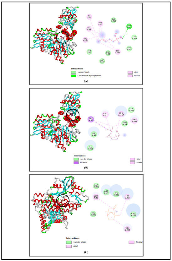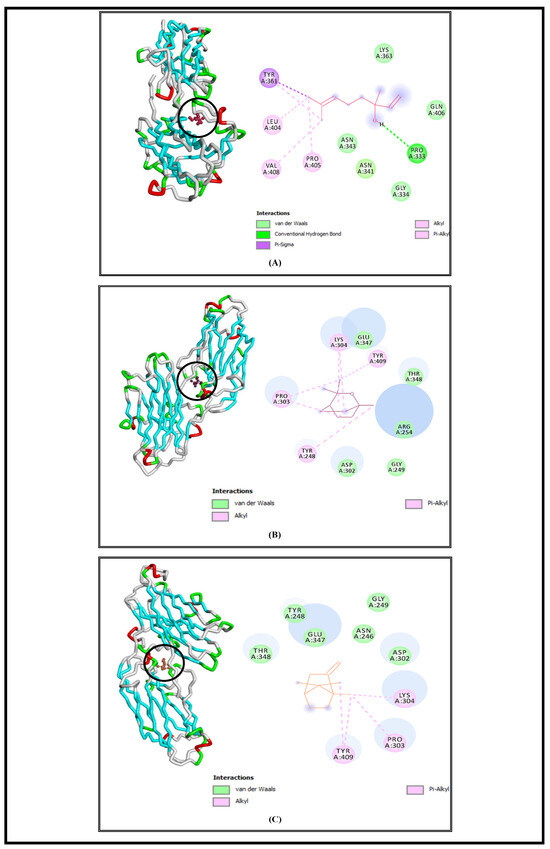 Linalool complex with the (SrtA) protein receptor of S. aureus displayed the presence of alkyl and Pi–alkyl interactions via LEU404, VAL408, and PRO405; van der Waals interactions with LYS363, GLN406, GLY334, ASN341, and ASN343; one conventional hydrogen bond with PRO333; and Pi–sigma interaction with TYR361 (Figure 3A). Additionally, eucalyptol showed various interactions with the selected virulence factor of S. aureus. It indicated the existence of alkyl and Pi–alkyl interactions with TYR248, PRO303, LYS304, and TYR409, and van der Waals interactions via GLU347, THR348, ARG254, GLY249, and ASP302 (Figure 3B). The complex of camphor with sortase A receptor was elaborated via alkyl and Pi–alkyl interactions with LYS304, PRO303, and TYR409, and van der Waals interactions with THR348, TYR248, GLU347, ASN246, GLY249, and ASP302 (Figure 3C).