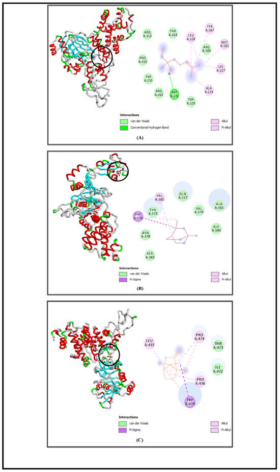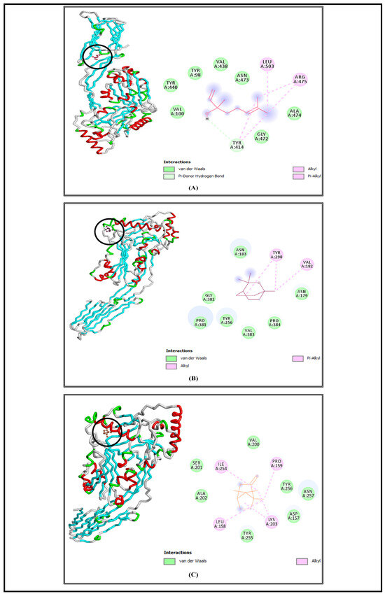 Interaction complexes of linalool (A), eucalyptol (B), and camphor (C) with the listeriolysin O protein of L. monocytogenes.