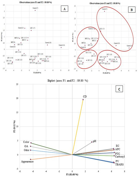 On the other side, the optimized formulation was employed in the proportions of 33.5% for L, 33.2% for E, and 33.4% for C. The treatment of the three other samples corresponds to (1-L/E/C), (1.5-L/E/C), and (2-L/E/C), which were, respectively, 16 µg/mL (containing 5.36 µg of L, 5.312 µg of E, and 5.344 µg of C), 24 µg/mL (containing 8.04 µg of L, 7.968 µg of E, and 8.016 µg of C), and 32 µg/mL (containing 10.72 µg of L, 10.624 µg of E, and 10.688 µg of C). The application of L/E/C mixture at different concentrations was undertaken via their direct addition to the samples and subsequent homogenization under the microbiological hood to avoid any external contamination. All the samples were then aseptically stored during 14 days at 4 °C. A total of 75 trials (5 × 3 × 5) were employed as follows: five treatments (control, BHT, (1-L/E/C), (1.5-L/E/C), and (2-L/E/C)) for three sub-samples over the sampling period (five storage days: 0, 3, 7, 10, and 14 days).