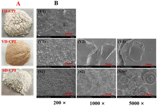 The appearances (A) and SEM images (B) of FD-CPI, VD-CPI, and SD-CPI. F1 indicates SEM image of FD-CPI at magnification of 200×. V1–V3 and S1–S3 indicate SEM images of VD-CPI, and SD-CPI at different magnifications (200×, 1000×, and 5000×), respectively.