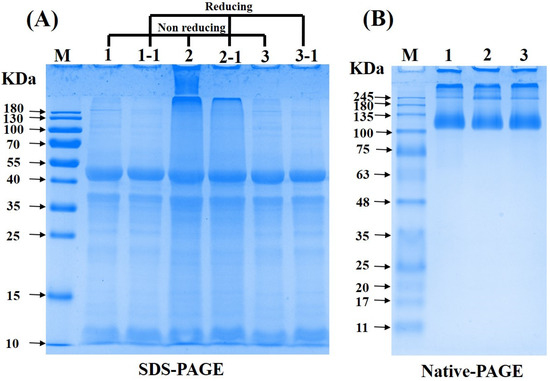 SDS-PAGE and Native-PAGE were performed according to the method of Yan and Gao et al. (2021) [], with minor modifications. For SDS-PAGE, an electrophoretic system with 5% stacking gel and 12% resolving acrylamide gel was used. Samples (2 mg/mL) were prepared under reducing (with β-mercaptoethanol) and non-reducing (without β-mercaptoethanol) conditions, respectively. Then, 10 μL of sample and protein standards (10–180 kDa) were added to the corresponding loading wells, respectively. The electrophoresis was firstly performed at 80 V constant pressure toward the resolving gel and then at 120 V constant pressure toward the bottom.