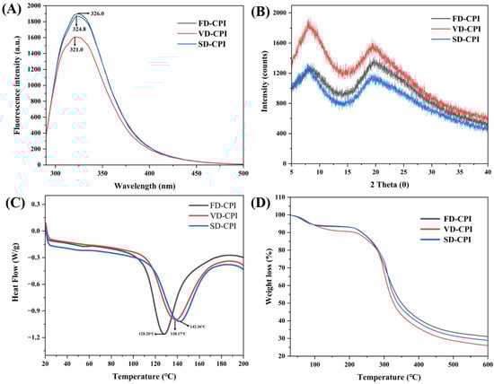 Intrinsic fluorescence spectra (A), X-ray diffraction pattern (B), differential scanning calorimetry pattern (C), and thermogravimetric analysis (D) of FD-CPI, VD-CPI, and SD-CPI.