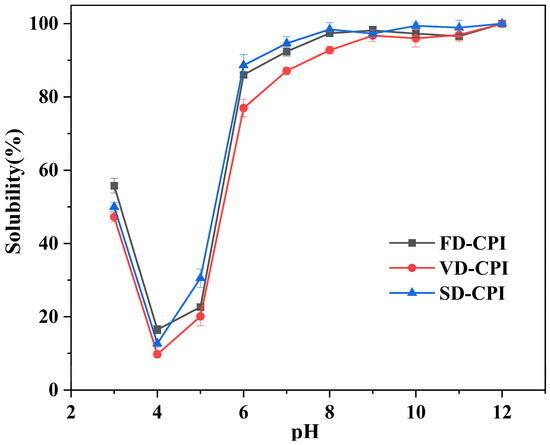 Solubility curves of FD-CPI, VD-CPI, and SD-CPI at pH values of 3–12.
