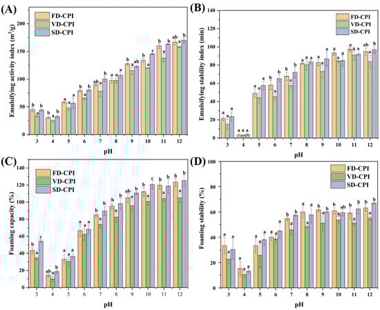 Emulsifying properties (A,B) and foaming properties (C,D) of FD-CPI, VD-CPI, and SD-CPI at pH values of 3–12. Means with different superscript letters (a, b, c) within the same pH value are significantly different (p < 0.05).