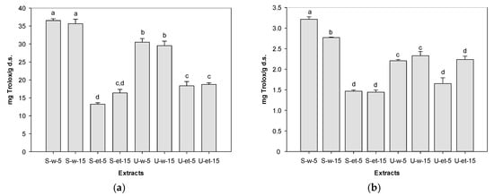 Antioxidant activity of extracts based on factorial design extraction. (a) ABTS; (b) DPPH. Different letters indicate significant differences, according to the Tukey test (p < 0.05). S: stirring; U: ultrasound; w: water; et: ethanol; 5 and 15: time (min).