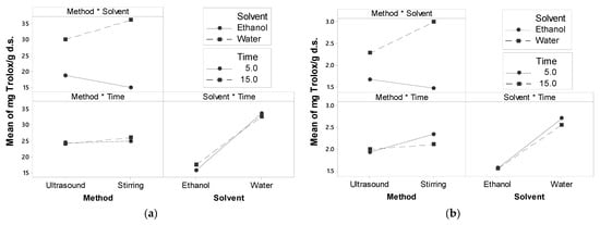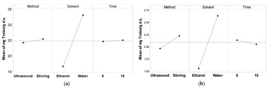 Figure 2 illustrates the effect of method, solvent, and time extraction on antioxidant activity. In both methods, the solvent was the most significant factor, and level 2 (water) had a greater effect on antioxidant capacity. Additionally, a slight significant effect of the extraction method was observed in the DPPH method (Figure 2b).