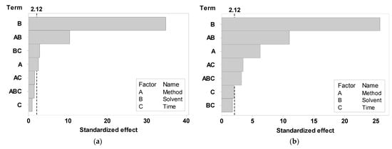 The Pareto chart indicated the following sequence of the main and interaction effects of extraction factors on antioxidant activity. For ABTS: B (solvent) > AB (method and solvent) > BC (solvent and time) > A (method) > AC (method and time) > ABC (method, solvent, and time) > C (time), while B (solvent) > AB (method and solvent) > A (method) > AC (method and time) > ABC (method, solvent, and time) > C (time) > BC (solvent and time) for the DPPH radical (Figure 4).