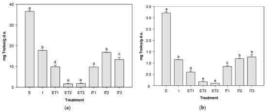 Antioxidant activity of extract, infusion, and microencapsulates. (a) ABTS; (b) DPPH. Different letters indicate significant differences, according to the Tukey test (p < 0.05). E: extract; I: infusion; T1: maltodextrin; T2: arabic gum; T3: maltodextrin–arabic gum.