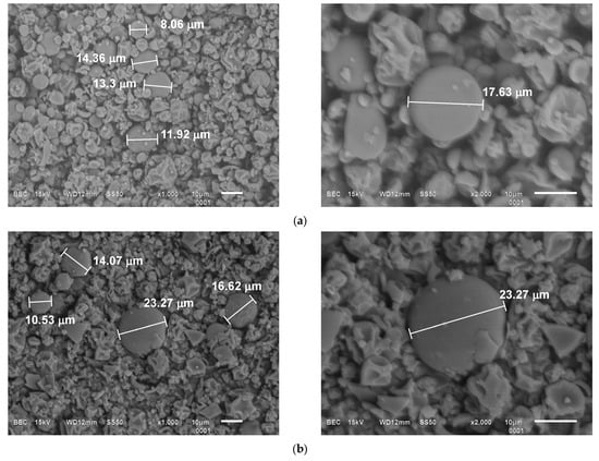 Figure 6 shows the micrographs of powders. The average size of the microcapsules was 13.05 ± 3.13 μm and 16.12 ± 4.66 μm, for ET1 and IT3, respectively, with no significant differences in samples (p < 0.05). Regarding the morphology, both powders presented spherical capsules and, in a more considerable proportion, irregular, collapsed capsules with dents on their surface. At first glance, the microcapsules with a regular appearance of ET1 (Figure 6a) displayed a more defined shape. This may result from the more significant concentration of MD in ET1 since it generally confers better protection against thermal degradation by enhancing the glass transition temperature (Tg) of wall materials, pre-venting the collapse of capsules [55].