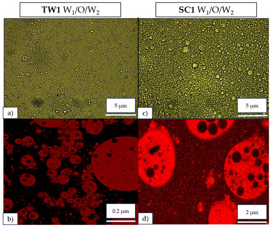 Optical and confocal microscopy observations revealed that all formulated double emulsions were correctly formed, so it is possible to recognize their different layers (Figure 2). As expected, the emulsions were formed by an inner phase of small droplets (W1) surrounded by the oil phase (O), giving place to the inner emulsion (W1/O). In addition, these primary emulsion particles were covered by the outer continuous phase (W2), thereby achieving the formation of the complete double emulsion systems (W1/O/W2). The small, colored droplets in the W1 phase also confirm the introduction of OFC extracts into the inner phase. Specifically, confocal microscopy using the Nile Red dye allowed us to stain the oil droplets from the inner emulsion phases as seen in images (b) and (d). Optical and confocal microscopy images of the double emulsion systems TW1 and SC1 (both containing 1 g of OFC pulp extract encapsulated) can be seen in Figure 2.