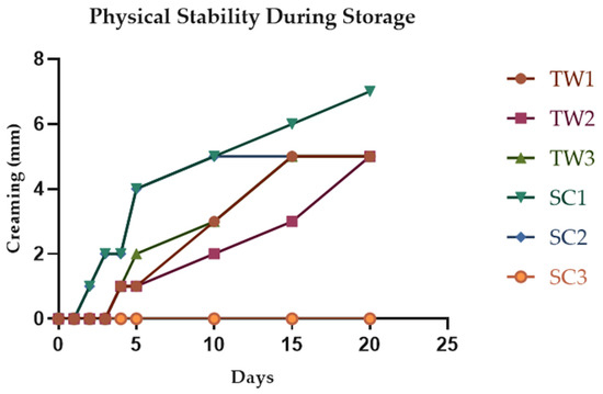 The analysis of physical stability of TW and SC double emulsions (W1/O/W2) was performed according to Hong et al. [25]. The stability was expressed in mm of creaming (gravitational phase separation), and it was measured in triplicate during sample storage at 7 °C for 20 days.