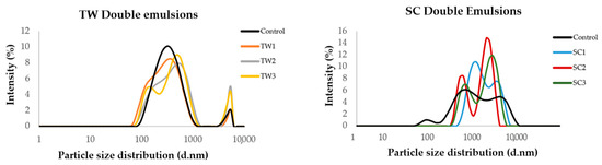 In Figure 4, we can see the particle size distribution analysis of the TW and SC double emulsion systems just elaborated (day 0). Regarding TW emulsions, all of them showed two particle size populations, with the most important being the first one with an average size of 280 nm. The control emulsion showed more homogeneity in the particle size distribution, while those with encapsulated OFC extract were more heterogeneous. With respect to SC emulsions, the control emulsion showed three particle size populations, while the emulsions with encapsulated OFC extract showed two (Figure 4). In this case, all of the samples showed more heterogeneity in comparison with TW emulsions, which is attributable to the composition of these systems.