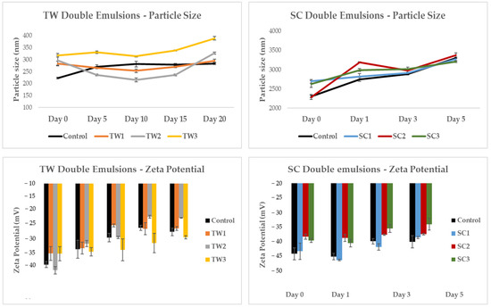In Figure 5 we can see the individual data of the particle size and zeta potential of each emulsion during conservation. TW emulsions showed smaller particle sizes than SC emulsions, specifically, the particles that constituted SC emulsions showed ten times larger sizes (from 2286 ± 42 to 3373 ± 64 nm) than TW emulsions (from 223 ± 3 to 389 ± 7 nm). Velderrain-Rodríguez et al. [30] used different surfactants to encapsulate phenolic compounds extracted from mango peels, and they also obtained lower particle sizes when using Tween 20. With respect to the different particle sizes in both types of double emulsions with encapsulated OFC pulp extracts at different concentrations (1, 2, or 3 g), those with higher concentrations (3 g of OFC extract) showed the biggest droplet sizes (from 314 ± 3 to 389 ± 7 for TW3 and from 2622 ± 86 to 3202 ± 21 for SC3), while those with no extract encapsulated (control emulsions) showed the smallest ones (from 223 ± 3 to 283 ± 3 for TW control and from 2301 ± 34 to 3001 ± 19 for SC control) (Figure 5).