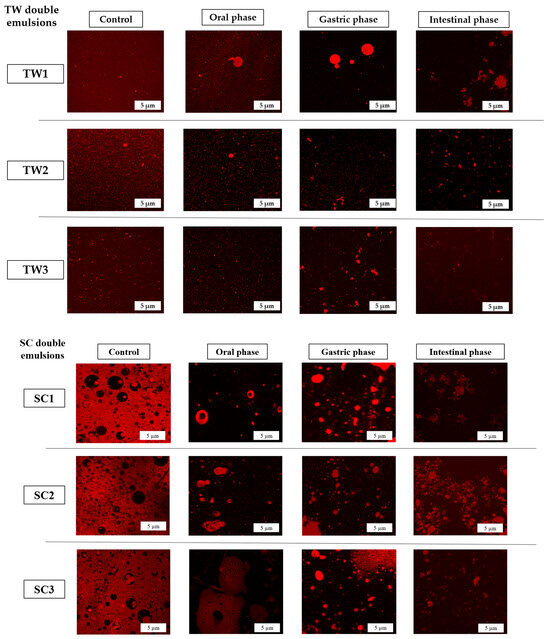 Confocal Laser Microscopy allows us to obtain detailed information on complex structures such as the double emulsions [39], as was mentioned before. Figure 6 shows the changes in the structure of TW and SC double emulsion systems with encapsulated OFC extract during in vitro gastro-intestinal digestion phases.