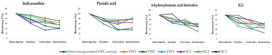 Digestive stability and bioaccessibility of the main bioactives from Opuntia ficus-indica var. Colorada pulp green extracts and the encapsulated ones by the double emulsion systems based on Tween 20 (TW) and on sodium caseinate (SC) are shown in Table 7 and Table 8, respectively. Recovery data of the individual bioactives through digestion process, calculated on the basis of the digestive stability and represented graphically, are shown in Figure 7.
