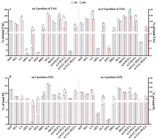 The positional distributions of fatty acids in TAG molecules are shown in Figure 1A and Table S3. High proportions of 16:0, 18:0, DHA, SFA and n-3 LC-PUFA were detected in the sn-2-position, while 16:1, 18:1, LA, ALA, ARA, EPA, MUFA and n-6 PUFA were preferentially positioned at the sn-1/3 (p > 0.05) position. Regarding the fatty acid distribution of PL molecules (Figure 1B and Table S3), the percentage of SFA, n-3 PUFA and n-3 LC-PUFA in the sn-2 position was higher than that in the sn-1 position (p < 0.05), while LA and ALA were preferentially distributed in the sn-1 position, which had the same trend as that of TAG molecules. Although the positional distribution characteristics of most fatty acids in ATG and PL showed a similar trend, high concentrations of EPA and ARA tended to accumulate at the sn-1/3 and sn-2 positions of ATG and PL molecules, respectively. Among the two groups, the amount of n-3 PUFA and n-3 LC-PUFA at the sn-2 and sn-1/3 (or sn-1) positions of TAG and PL in the BO group was much higher than that in the SO group (p < 0.05), whereas the opposite was true for n-6 PUFA.