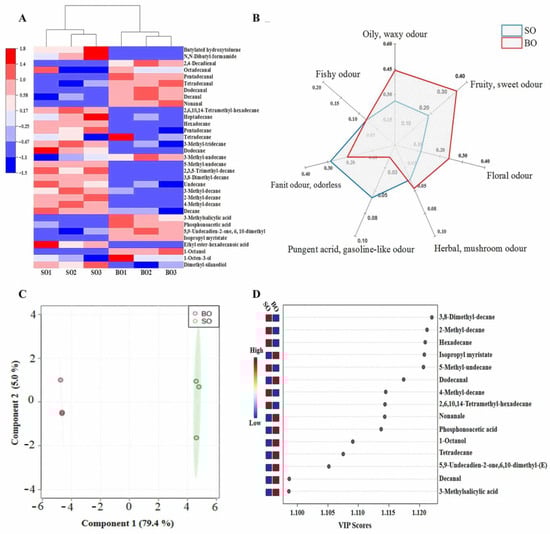 A heat map of volatile substances obtained by GC-MS is shown in Figure 2A and Table S4. The distribution of different volatile substances in the two groups is different. The contents of decane, undecane and dodecane were relatively higher in the SO group, while higher 1-octen-3-ol, 1-octanol, nonanal and decanal contents were observed in the BO group. As shown in Figure 2B, the volatile compounds with oily, waxy, fruity, sweet, and floral odors were higher in the BO group than those in the SO group (p < 0.05), whereas the opposite was true for the compounds with pungent acrid, gasoline-like, and faint odor and lacking odor, which suggested that BO diets can modify the farmed tilapia flavor by favoring the contents of volatile aldehydes and alcohols.