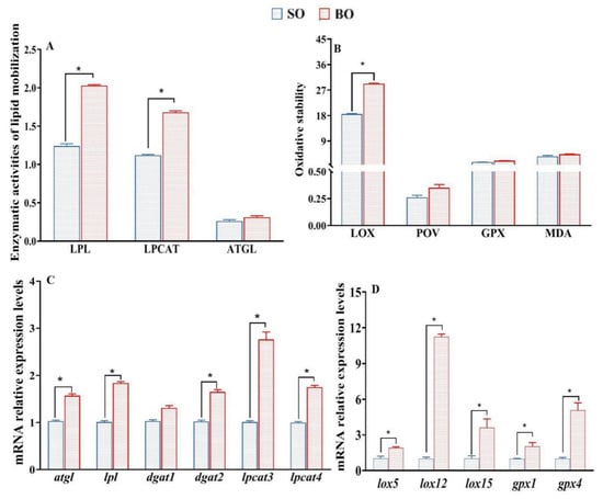 The oxidative stability of muscle lipids was evaluated by the enzymatic activities of LOX and GPX, their gene expression levels, and the contents of POV and MDA, which are shown in Figure 3B,D. Compared to the SO group, the muscular LOX activities in the BO group were significantly higher (p < 0.05). Although the POV content and GPX activities of the BO group were 34.62% and 29.60% higher than those of the SO group, respectively, the content of neither POV nor MDA nor GPX activities demonstrated a statistical difference between the SO and BO groups (p > 0.05). Accordingly, the mRNA levels of genes related to fatty acid oxidation (lox5, lox12, lox15, gpx1, and gpx4) in the BO group were higher than those in the SO group (p > 0.05) (Figure 3D). Specifically, muscular lox12 and gpx4 mRNA levels in the BO group were eleven- and fivefold those in the SO group (p < 0.05), respectively, which is a greater variation than those of other lox genes (lox2 and lox15) and gpx1 genes.