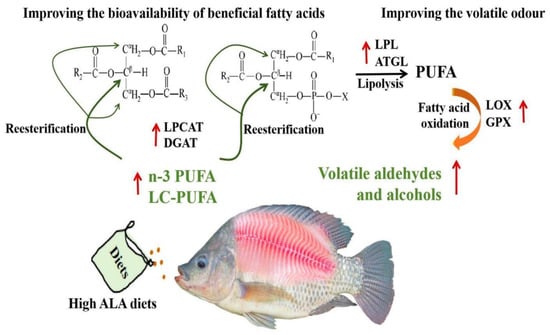 In summary, based on the nutritional value of muscle and bioavailability of fatty acids, volatile flavor, enzyme activity and gene expression related to lipolysis and lipid oxidation, the present study demonstrated that high-ALA diets increased n-3 LC-PUFA levels in the muscle of tilapia and modified the bioavailability of beneficial fatty acids in lipid molecules by improving lipid remodeling (LPCAT). Additionally, the muscular volatile aldehydes and alcohol levels increased with the increased muscle n-3 PUFA and LC-PUFA levels, as well as dietary ALA supply. Furthermore, high-ALA diets are beneficial for lipolysis (LPL and ATGL) and fatty acid oxidation (LOX and GPX) of farmed tilapia. These findings indicate that high α-linolenic acid diets modify muscle fatty acid bioavailability, as well as volatile odors by enhancing lipid mobilization (lipid reesterification and lipolysis) and fatty acid oxidation in farmed tilapia (Figure 4). To our knowledge, our findings provide new insights for understanding the modification of muscle nutrition and odor value in farmed tilapia by dietary fatty acid strategies.