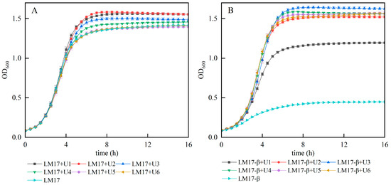Our prior research has substantiated that urea can enhance the growth of S. thermophilus S-3 and augment its biomass in CDM medium. To further investigate whether urea can increase the biomass of S. thermophilus S-3 in M17 medium, we conducted growth experiments by adding different concentrations of urea (1~6 g/L, denoted as U1~U6) to both M17 medium and β-GP-deficient M17 medium (M17-β). The experimental results (Figure 1) indicated that a lower concentration of urea (1~2 g/L) in M17 medium is more conducive to cell growth than a higher concentration, with the maximum biomass observed at a urea concentration of 2 g/L (Figure 1A). In experiments where urea replaced β-GP (Figure 1B), the cell biomass in the β-GP-deficient medium was minimal, but a low concentration of urea (1 g/L) could significantly enhance the biomass. When the amount of urea added reached 3 g/L, the biomass peaked and was significantly higher than that in M17 medium (p < 0.05), suggesting that urea can substitute for β-GP in M17 medium. However, in both M17 and M17-β media, when the urea concentration exceeded a certain threshold, the biomass showed a certain degree of decline, implying that an excessively high concentration of urea is not conducive to the increase in biomass. Therefore, the optimal level of urea addition was determined to be 3 g/L.