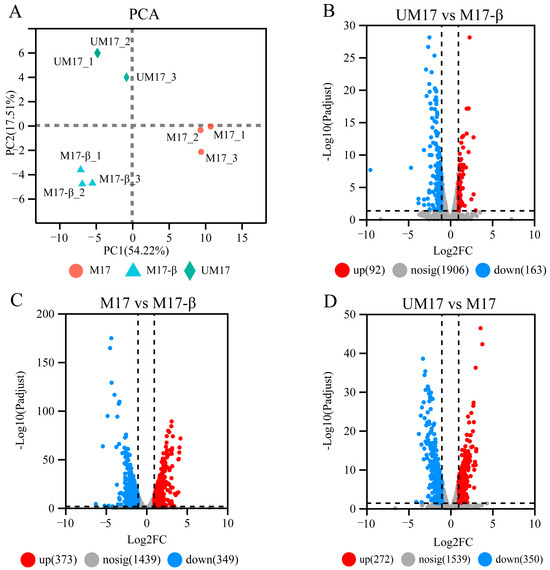 Metabolic variations among comparisons of UM17 vs. M17-β, M17 vs. M17-β, and UM17 vs. M17 were performed using LC-MS. A total of 1076 annotated metabolites were detected (number of ESI+ and ESI− ions was 583 and 493, respectively; Table S4). PCA and PLS-DA showed significant differences among all groups in both positive and negative models (Figure 5A–D). The intercept of the Q2 regression line obtained by the Permutation test is less than 0.05 (Figure 5E,F), indicating that the model robustness is reliable and no overfitting has occurred. Based on the variable importance in projection (VIP) score >1 and p-values < 0.05, relative to M17-β, 459 and 421 DAMs were screened in UM17 and M17, respectively (Figure 6A,B). Notably, just 251 annotated metabolites were screened between UM17 and M17 (Figure 6C).