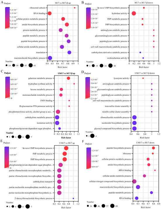 The top 10 upregulated and downregulated enriched GO annotations of M17 vs. M17-β (A,B), UM17 vs. M17-β (C,D), UM17 vs. M17 (E,F). The x-axis represents the Rich factor, the y-axis represents the GO term, the size of the dot indicates the number of genes/transcripts in this GO term, and the color of the dot corresponds to different ranges of FDR (p-value corrected).