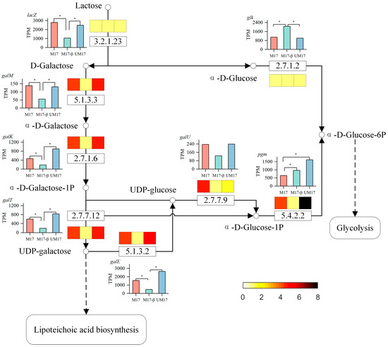 Using the KEGG mapper tool [23], all common reactions generated by REMI in all alternative solutions were mapped onto the KEGG pathway. These common reactions play a crucial role—they persist across all alternative solutions, regardless of the metabolic network’s adaptations to varying physiological conditions. As such, they serve as potential targets for metabolic regulation. The list of the common reactions is proved in Table S8. Nucleotide metabolism is the pathway with the most common reactions in both cases, with 13 reactions (out of a total of 31 reactions) in M17 and 8 reactions (out of a total of 20 reactions) in UM17, most of which are related to DNA synthesis. The next is carbohydrate metabolism, where multiple reactions in galactose metabolism appear simultaneously in both the M17 and UM17 groups, suggesting that the galactose metabolism pathway may be related to the proliferation of S. thermophilus. To delve deeper, we further analyzed the flux of galactose metabolism based on the model and omics data (Figure 7). When lactose serves as the carbon source, the enzyme β-galactosidase (3.2.1.23) hydrolyzes lactose into galactose and glucose. Glucose directly enters the glycolysis pathway. Part of galactose is excreted outside the cell through the lactose transport system. Another part of galactose enters the galactose metabolism pathway. It is catalyzed by aldose-1-epimerase (5.1.3.3) and galactokinase (2.7.1.6) to produce α-D-Galactose-1-phosphate, which reacts with UDP-glucose to produce UDP-galactose and α-D-Glucose-1-phosphate. Unlike other bacteria, the glucose moiety in the teichoic acid repeating unit structure of the Streptococcus genus is replaced by a galactose moiety [24], so one of the main metabolic fluxes of UDP-galactose is to enter the lipoteichoic acid synthesis pathway. α-D-Glucose-1-phosphate re-enters the glycolysis pathway. The relative abundance of UDP-galactose in the M17 and UM17 groups is downregulated compared to the M17-β group, and the relative abundance of α-D-Glucose-1-phosphate in the M17 group is upregulated compared to the other two groups.
