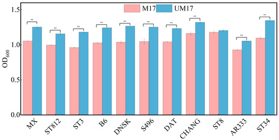 Through omics analysis, we observed significant transcriptional differences between the M17 and UM17 groups. However, both groups exhibited several common enriched metabolic pathways in the metabolome analysis. Additionally, REMI analysis revealed that both M17 and UM17 groups stimulated the flux of the galactose metabolic pathway, providing increased biomass precursors for cell growth. This suggests that the transcriptional mechanisms promoting cell growth via β-GP and urea may differ, but there is substantial metabolic overlap, with urea showing potential as a substitute for β-GP. To verify the applicability of UM17 medium for S. thermophilus cultivation, we cultured an additional 11 strains of this bacterium from our laboratory collection. After 12 h of cultivation, 10 out of 11 bacterial strains exhibited significantly higher biomass in UM17 medium compared to M17 medium, with only one strain showing no statistically significant difference between the two culture conditions (Figure 8).