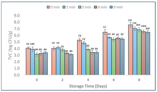 TVC in pork samples (vacuum packed, 0–8 days of storage at 4 °C) with different durations of CAP treatment (1, 3, 6, and 9 min) and untreated ones (0 min). Populations are shown as log transformations to base 10. Letters a and c indicate means that differ significantly (p < 0.05) between CAP treatment times on the same day. Letters w, x, y, and z indicate significant mean differences (p < 0.05) through storage within the same treatment. Error bars indicate the standard deviation; each treatment time was repeated in triplicates, and each set was replicated two times, resulting in n = 6.