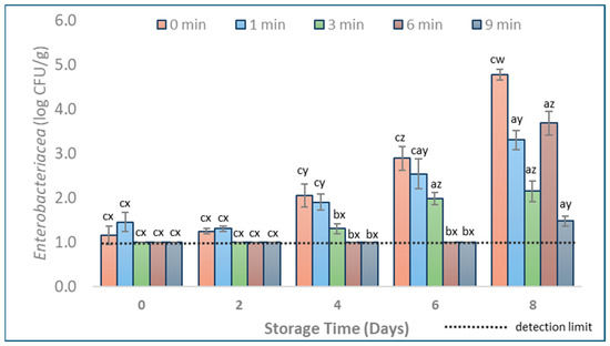 Enterobacteriaceae mean populations in pork samples (vacuum packed, 0–8 days of storage at 4 °C) with different durations of CAP treatment (1, 3, 6, and 9 min) and untreated ones (0 min). Populations are shown as log transformations to base 10. Letters a, b, and c indicate means that differ significantly (p < 0.05) between CAP treatment times on the same day. Letters w, x, y, and z indicate significant mean differences (p < 0.05) through storage within the same treatment. Error bars indicate the standard deviation; each treatment time was repeated in triplicates, and each set was replicated two times, resulting in n = 6. The detection limit was 1.0 log CFU/g.